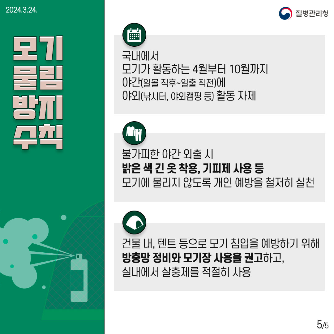- 야간 외출 시 긴 옷 착용 및 모기 기피제 사용