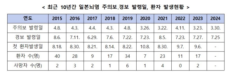 질병관리청이 7월 25일자로 전국에 일본뇌염 경보를 발령했습니다. 이는 경남과 전남 지역에서 일본뇌염 매개모기인 작은빨간집모기의 비율이 급증했기 때문입니다. 일본뇌염은 모기를 통해 전파되는 위험한 질병으로, 예방접종이 가장 효과적인 대비책입니다. 이번 경보는 경남과 전남 지역에서 일본뇌염 매개모기인 작은빨간집모기의 비율이 급증했기 때문입니다.