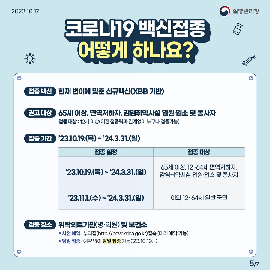 코로나19 예방을 위해서는 백신 접종이 필수입니다. 특히 65세 이상의 고위험군은 새로운 변이 바이러스에 대응하는 백신을 반드시 맞아야 합니다. 또한, 마스크 착용, 손 씻기, 사회적 거리두기와 같은 기본적인 위생 수칙을 철저히 지키는 것이 중요합니다. 마스크 착용 의무화는 없지만, 방역당국은 국민들에게 마스크 착용을 '강력 권고'하고 있습니다.