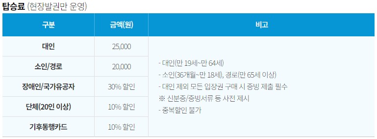 - 단체(20인 이상) 및 기후동행카드 소지자: 10% 할인