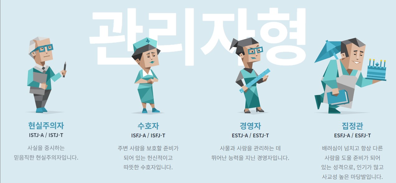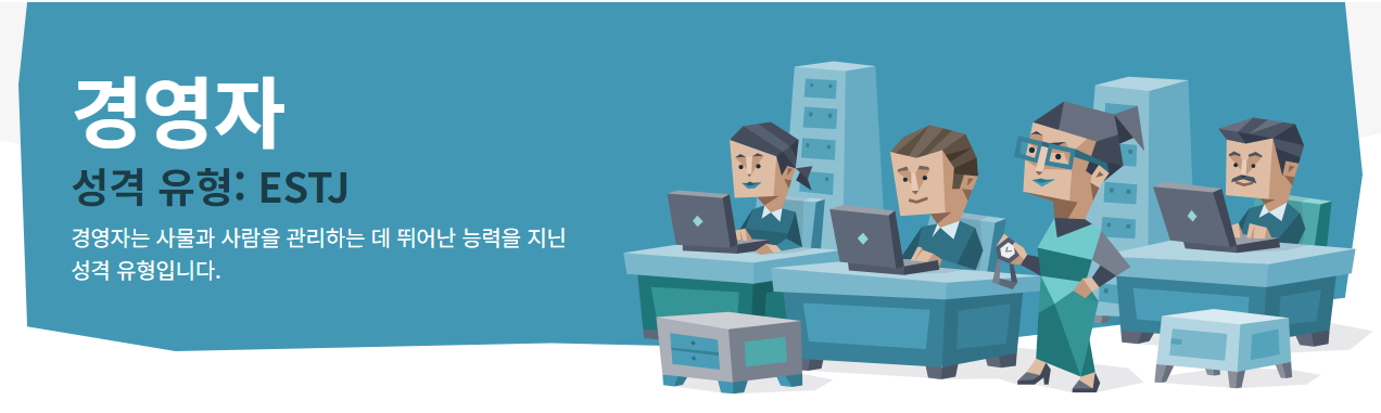 - ESTJ: 사물과 사람을 관리하는 데 뛰어난 능력을 발휘하는 경영자 스타일입니다.
