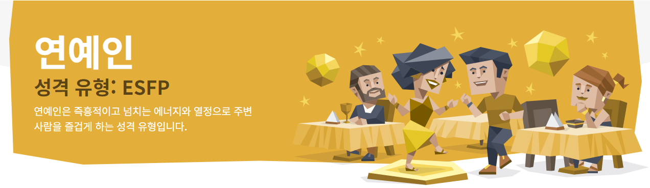 - ESFP: 즉흥적이고 에너지 넘치며, 주변 사람들에게 활력을 불어넣는 성격입니다.