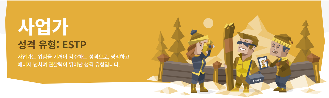 - ESTP: 위험을 감수하며, 영리하고 에너지 넘치는 사업가입니다.