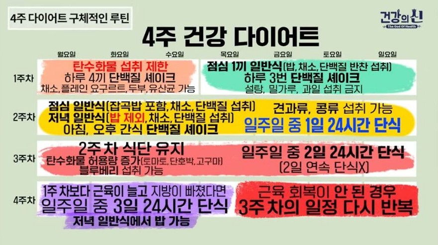 - 박용우 4주 다이어트 루틴의 효과를 극대화하기 위해, 근육량 상태를 지속적으로 모니터링하는 것이 중요합니다. 근육량이 유지된 경우에는 주 3회 단식을 계속 진행하지만, 근육량이 감소한 경우에는 3주 차의 프로그램을 반복하여 근육을 보존하면서 체지방을 줄입니다. 이 조치는 체중 감량 중 근육 손실을 방지하고, 건강한 체형을 유지하는 데 필수적입니다.