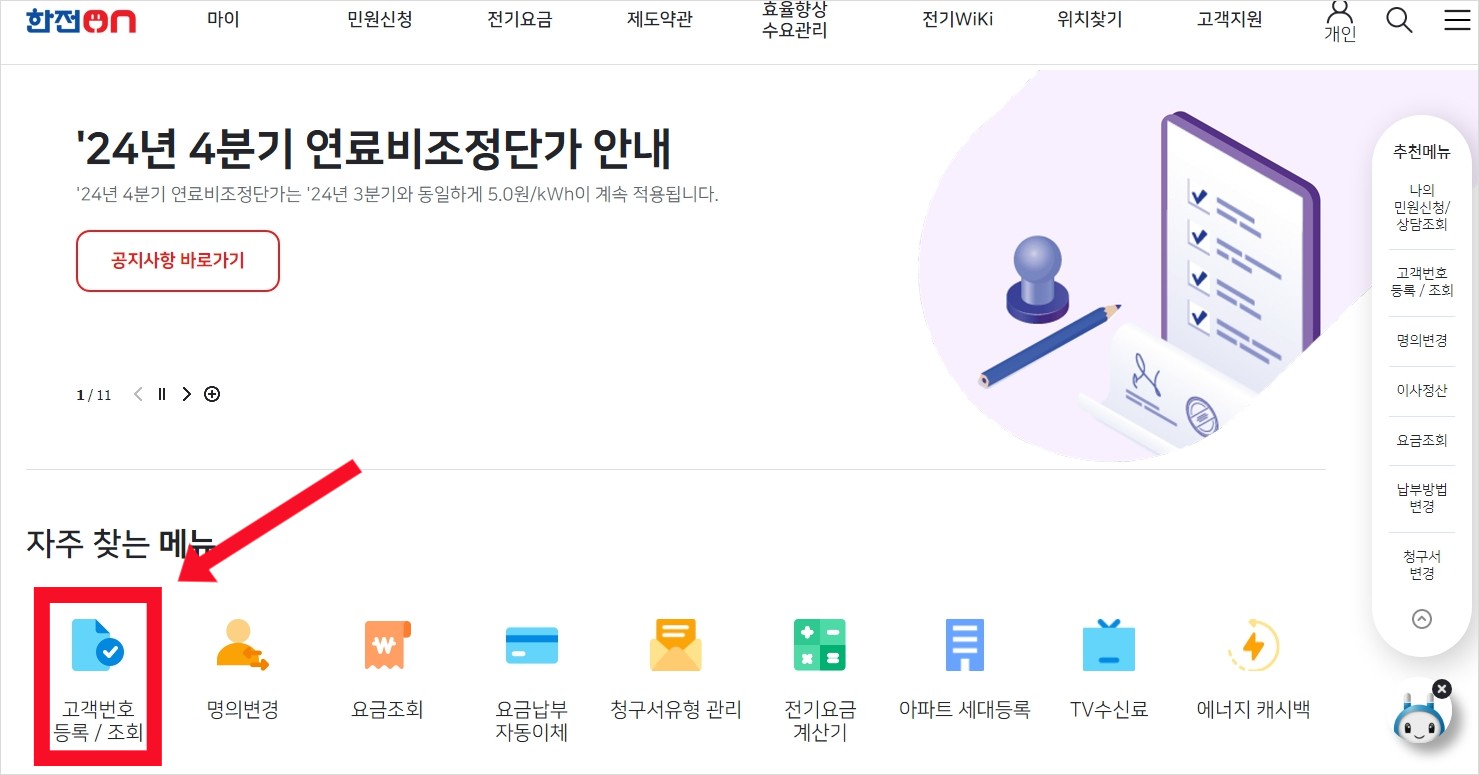 가장 일반적인 방법은 전기요금 고지서에서 고객번호를 확인하는 것입니다. 고지서 상단에 고객번호가 명시되어 있습니다.