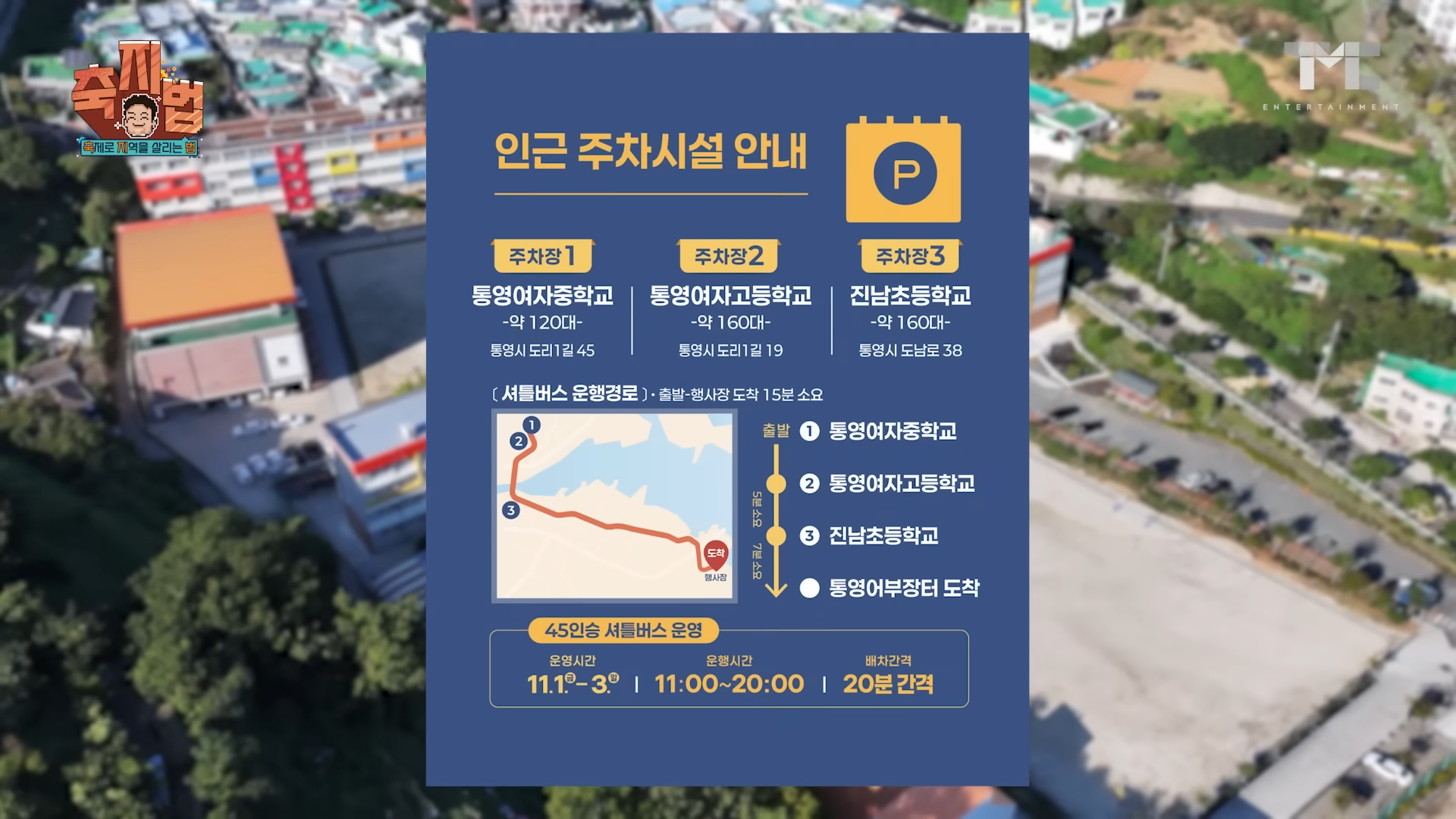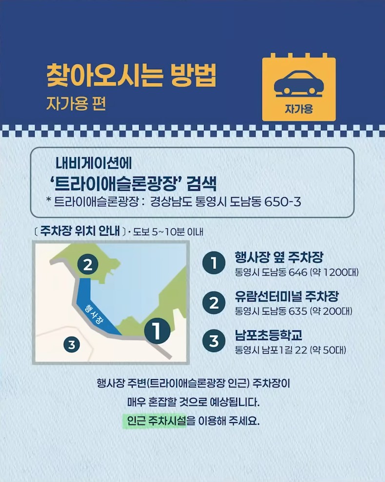 차를 가지고 오실 경우, 내비게이션에 **'트라이애슬론 광장'**을 검색하세요. 주소는 경상남도 통영시 도남동 650-3입니다. 행사장 근처에 도보로 5~10분 거리에 주차할 수 있는 곳이 많아요.