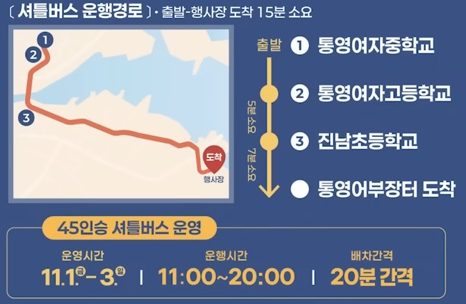 축제 기간 중 셔틀버스는 **11월 2일(토)**과 **11월 3일(일)**에만 운행됩니다. 셔틀버스는 행사장과 대건성당 앞(진남초교 옆), KT통영지사 앞(통영여중·여고)을 20분 간격으로 순환합니다.