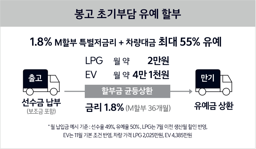 LPG 차량의 경우에도 저금리 할부 프로그램이 제공되며, 초기 부담을 낮출 수 있는 다양한 금융 지원이 준비되어 있습니다.