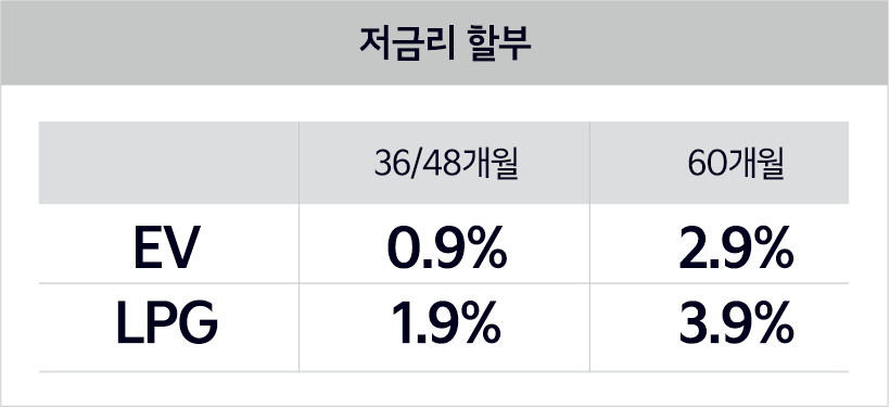 - LPG 차량 금융 혜택: 1.9% ~ 3.9%의 금리로 36개월 할부 가능