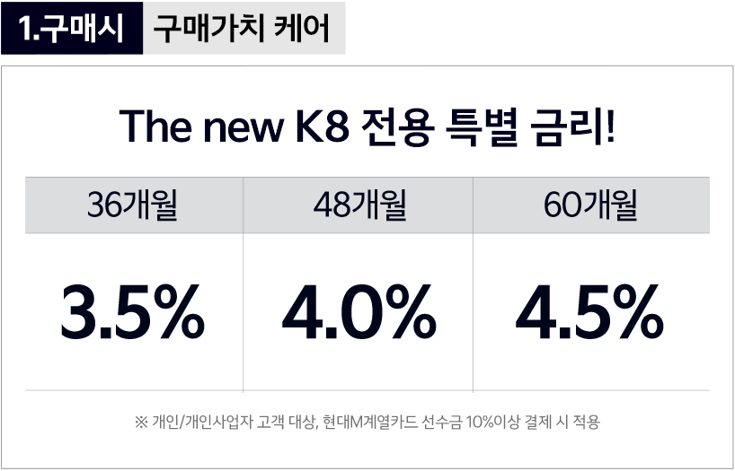 또한 'K-Value 할부' 프로그램을 통해 재판매 가치 60%를 보장받는 프로그램도 제공되어, 차량 구매 후 가치 보존에 대한 걱정을 줄여줍니다.