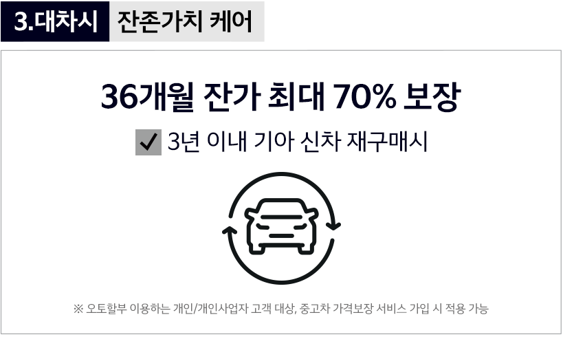 - 잔존가치 케어: 최대 70%까지의 잔존가치를 보장하는 프로그램으로, 일정 기간 내 차량을 반납할 경우 높은 가치를 인정받을 수 있습니다.