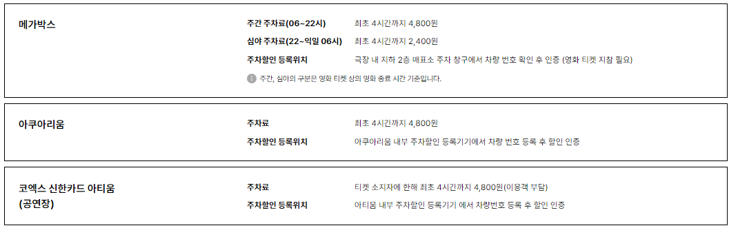- 코엑스 메가박스에서 영화를 관람하면 티켓을 제시하여 4시간 무료 주차를 받을 수 있습니다. 영화 관람 전후로 여유롭게 코엑스를 둘러볼 수 있는 좋은 기회입니다.