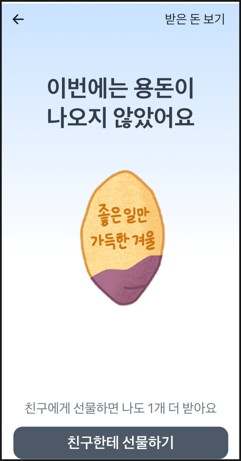 군고구마와 관련된 미션을 수행합니다. 미션의 종류와 난이도는 랜덤이며, 성공 시 보상으로 용돈 금액이 나타납니다. 즉시 사용할 수 있는 금액입니다. - 용돈 수령