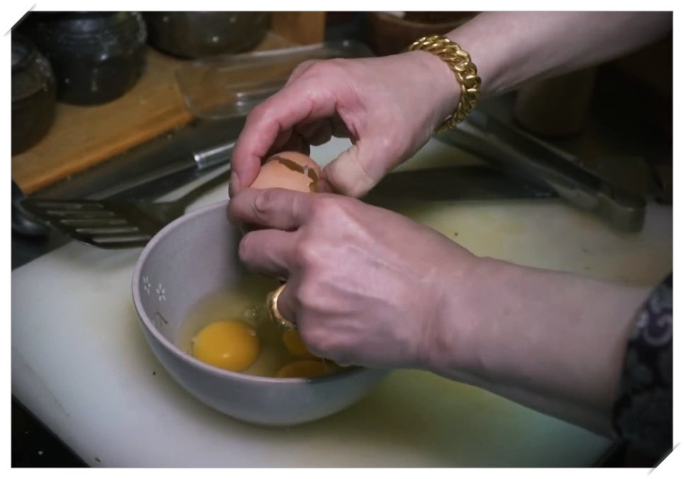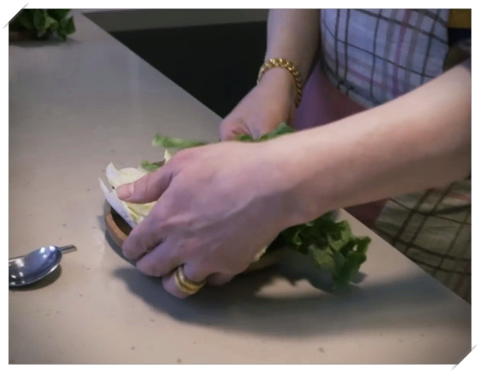 액세서리 착용: 조리 중 반지와 팔찌 등 액세서리를 착용한 모습이 포착되었습니다. 일반적으로 조리 시에는 위생을 위해 액세서리 착용을 지양하는 것이 권장됩니다.