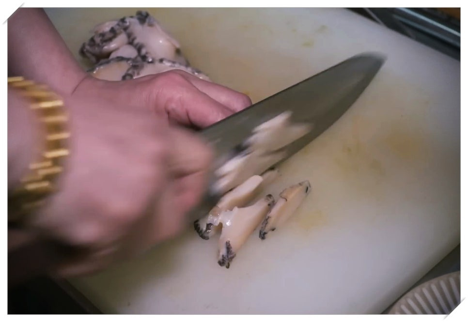 조리 도구 상태: 프라이팬 테두리에 기름때가 끼어 있는 모습이 보였으며, 도마 하나를 사용하여 전복, 수육, 생선, 오렌지 등 다양한 식재료를 처리하는 장면이 있었습니다. 이는 교차 오염의 위험성을 높일 수 있는 요소로 지적되었습니다.