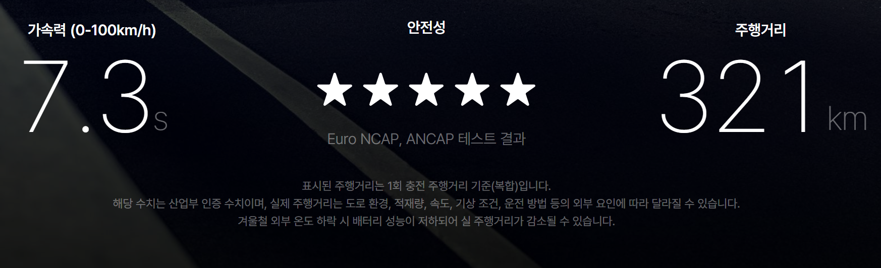 - 출력: 강력한 전기 모터로 0-100km/h 가속 시간이 7초대로 빠릅니다.