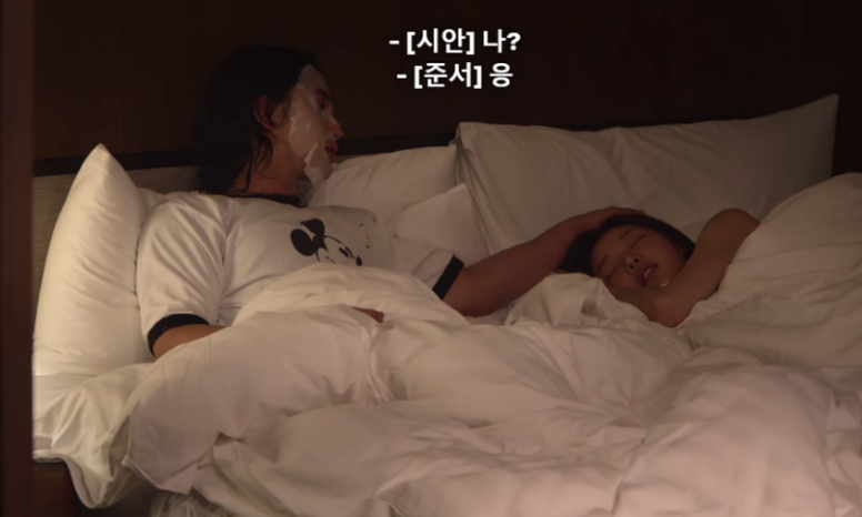 비록 시안이 얼굴에 팩을 붙이고 있어 분위기가 살짝 깨질 법도 했지만, 준서가 자연스럽게 시안의 머리를 쓰다듬고, 팔 위에 자신의 손을 얹는 모습은 그야말로 심쿵 그 자체였습니다.