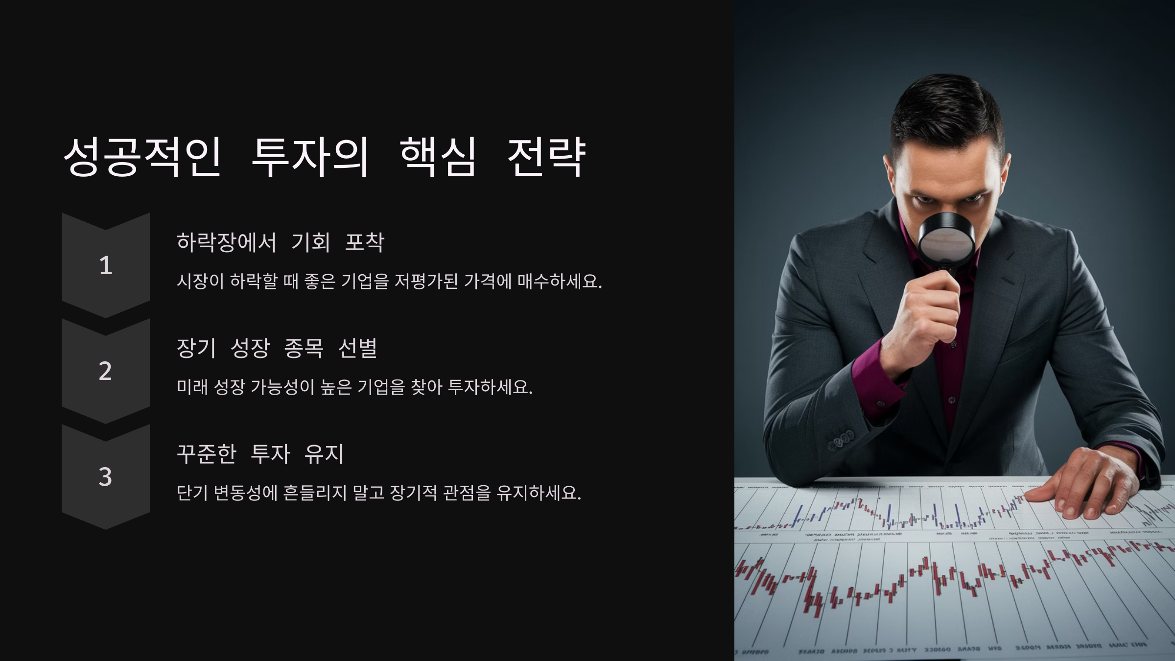 - 주가 변동에 감정적으로 반응하지 말고, 기업의 펀더멘털(재무 상태, 성장성 등)을 분석하세요.