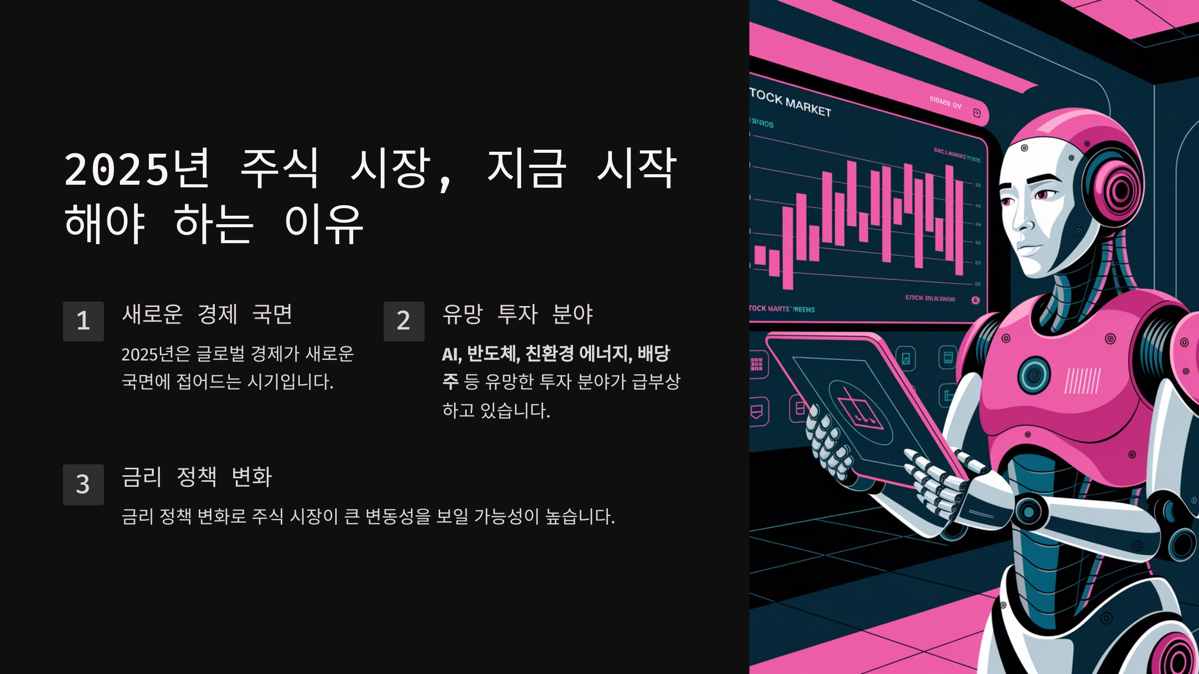 2025년은 글로벌 경제가 새로운 국면에 접어드는 시기입니다. AI, 반도체, 친환경 에너지, 배당주 등 유망한 투자 분야가 급부상하고 있으며, 금리 정책 변화로 주식 시장이 큰 변동성을 보일 가능성이 높습니다.