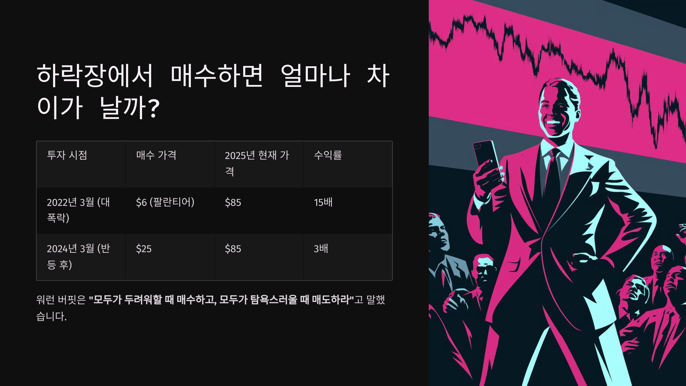 | 2022년 3월 (대폭락) | $6 (팔란티어) | $85 | 🚀 15배 |