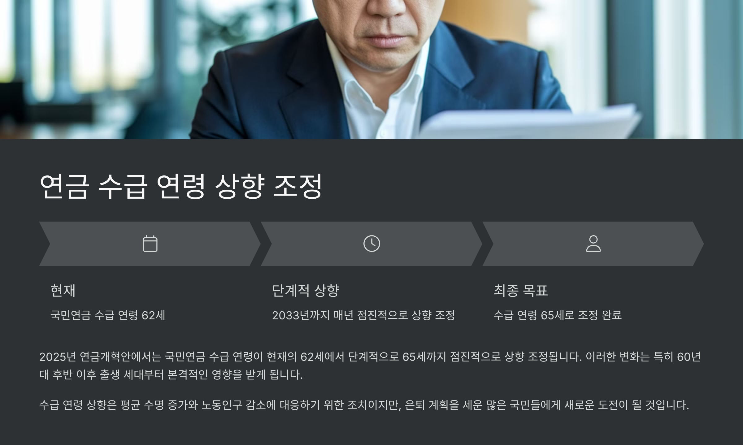 2025년 연금개혁안에서는 국민연금 수급 연령이 현재의 62세에서 단계적으로 65세까지 점진적으로 상향 조정됩니다. 구체적인 상향 조정 일정은 2033년까지 매년 점진적으로 진행되며, 특히 60년대 후반 이후 출생 세대부터 영향을 받게 됩니다.