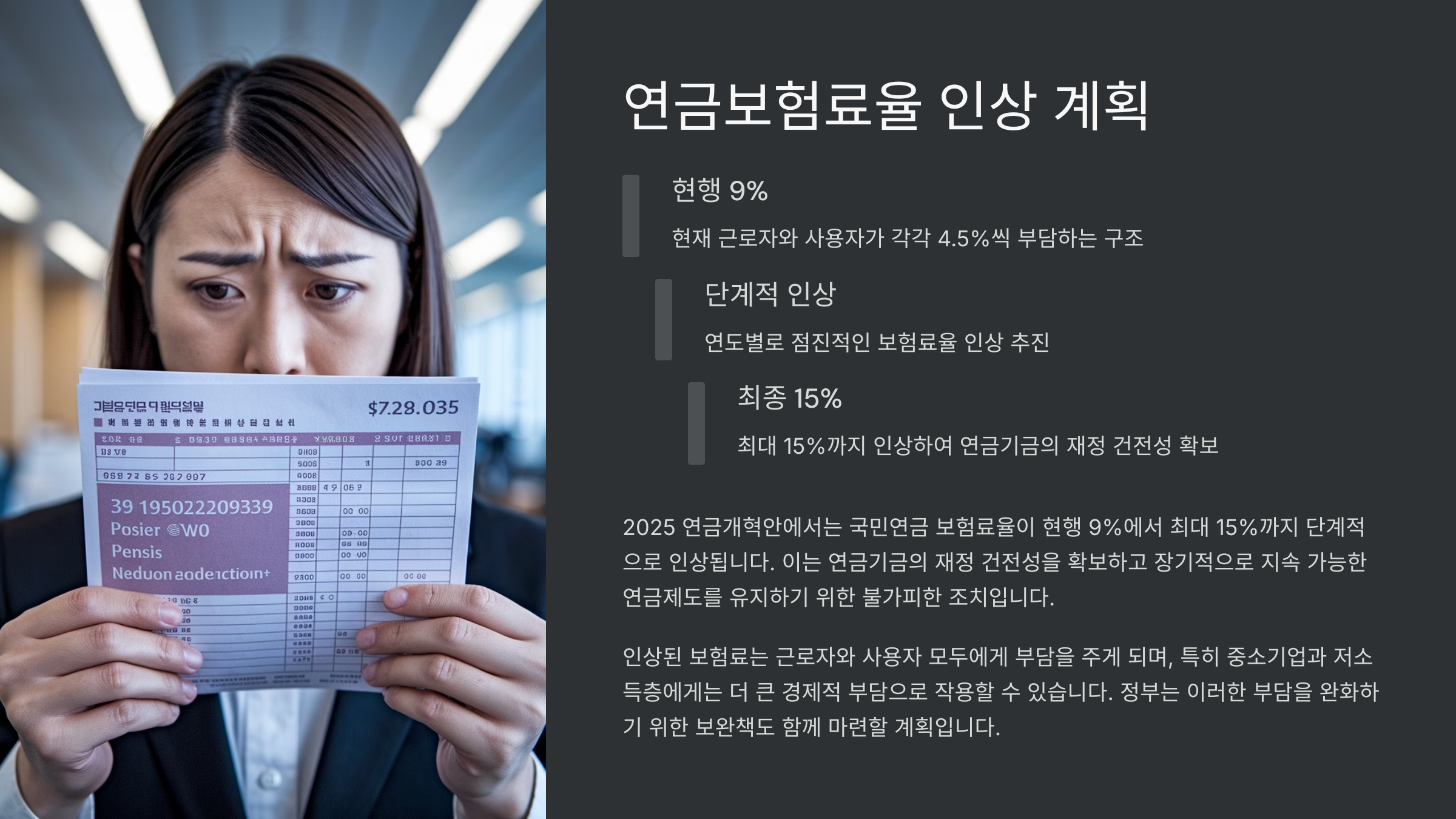 2025 연금개혁안에서는 국민연금 보험료율이 현행 9%에서 최대 15%까지 단계적으로 인상됩니다. 보험료율 인상은 연금기금의 재정 건전성을 확보하고 장기적으로 지속 가능한 연금제도를 유지하기 위한 불가피한 조치입니다. 인상된 보험료는 근로자와 사용자 모두에게 부담을 주게 됩니다.
