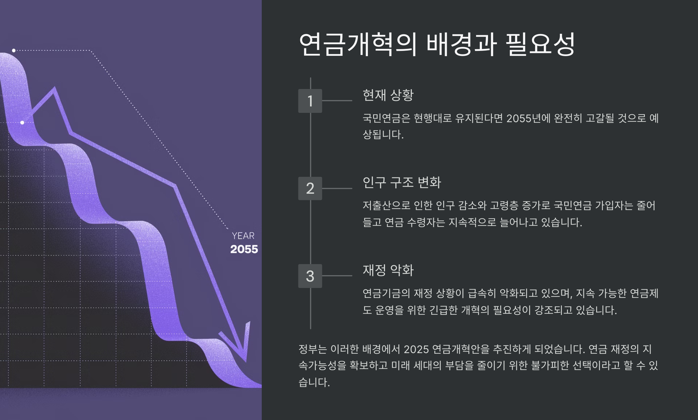 현재 국민연금은 현행대로 유지된다면 2055년에 완전히 고갈될 것으로 예상됩니다. 저출산으로 인한 인구 감소와 고령층 증가로 인해 국민연금 가입자는 줄어들고 연금 수령자는 지속적으로 늘어나고 있습니다. 이에 따라 연금기금의 재정 상황이 급속히 악화되고 있으며, 지속 가능한 연금제도 운영을 위한 긴급한 개혁의 필요성이 강조되고 있습니다. 정부는 이러한 배경에서 2025 연금개혁안을 추진하게 되었습니다.