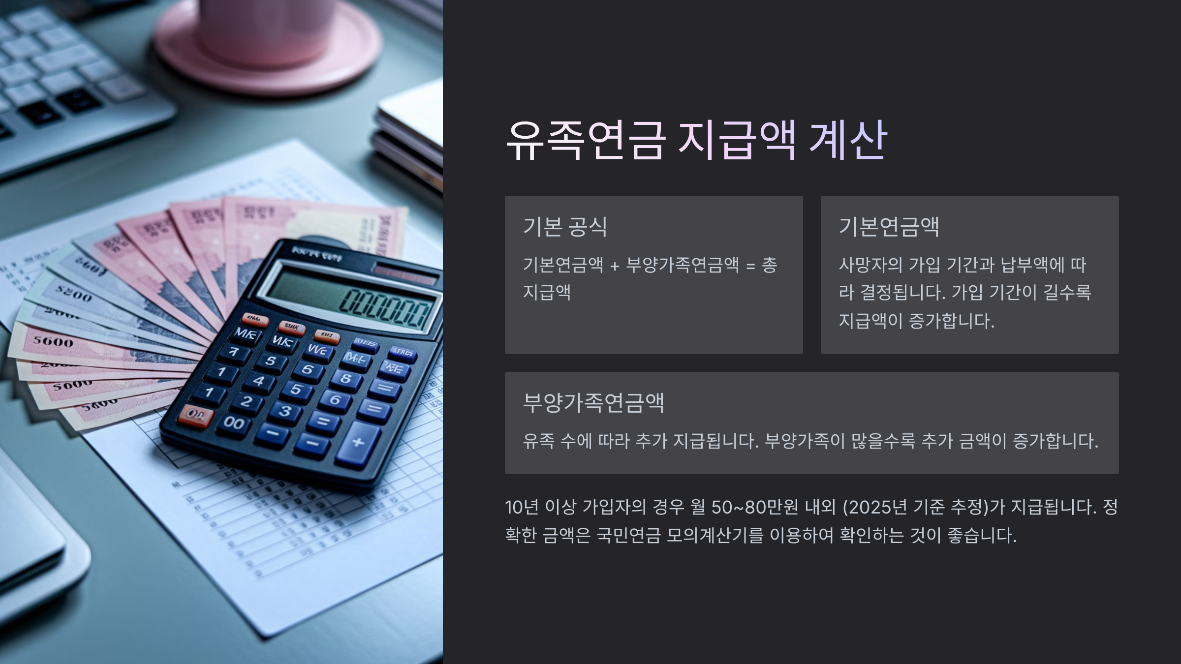 - 부양가족연금액: 유족 수에 따라 추가 지급