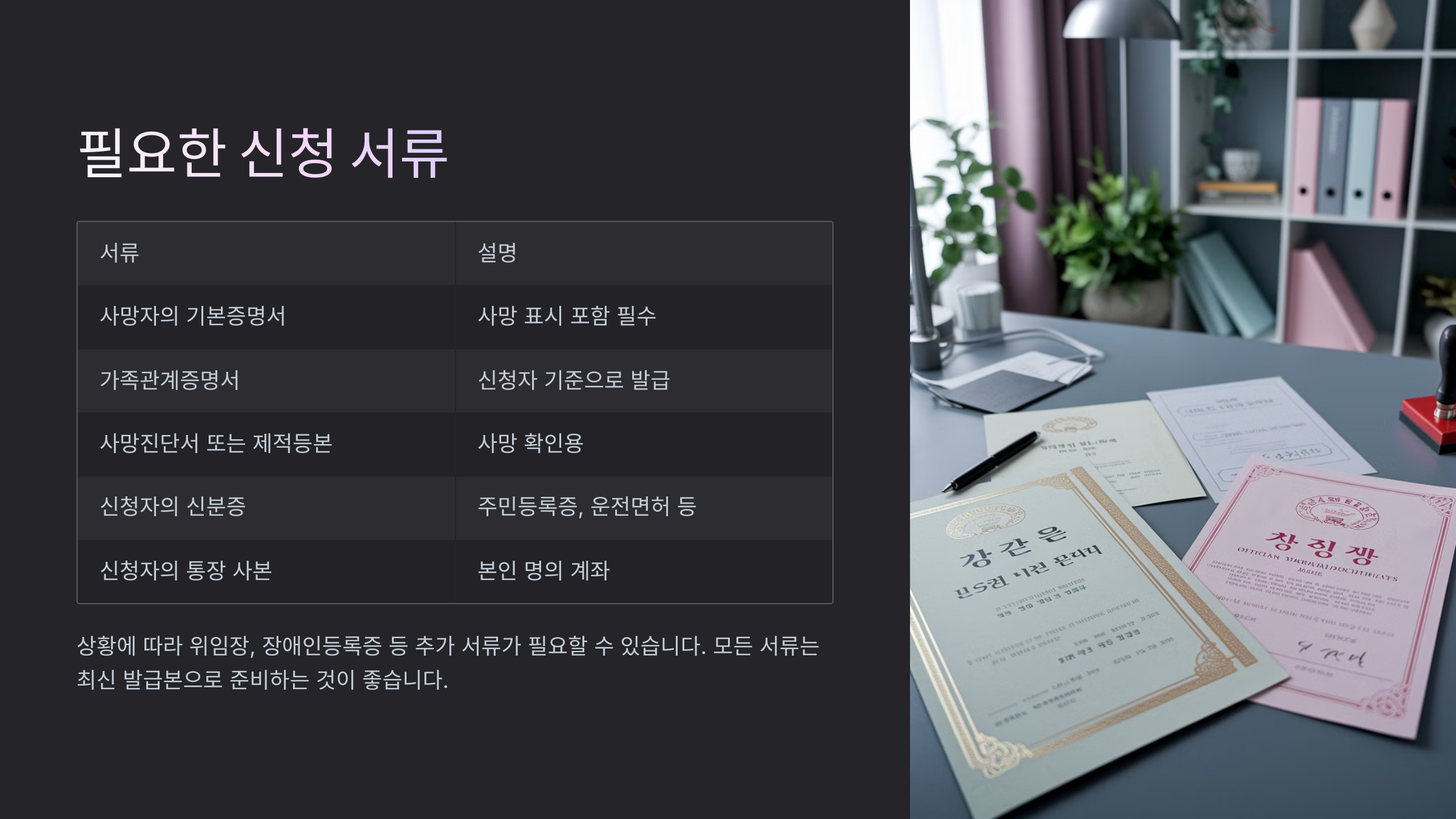 그러나 대부분 갑작스러운 사망 상황에서 신청 절차를 모르고 있으면, 정신적 충격에 더해 행정적 혼란이 크게 다가옵니다.