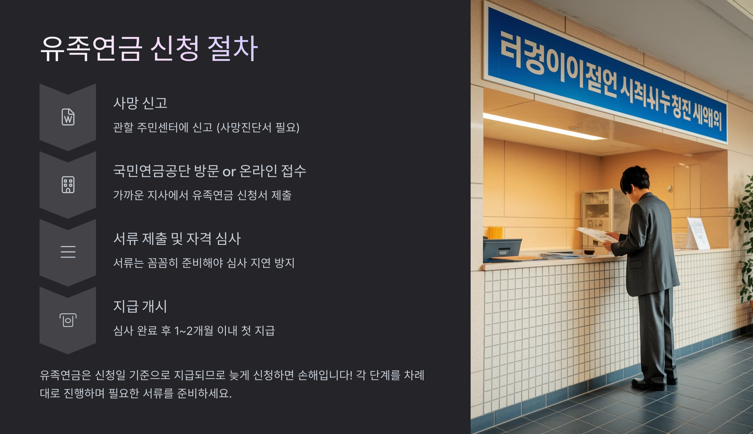 💡 유족연금은 신청일 기준으로 지급되므로 늦게 신청하면 손해입니다!