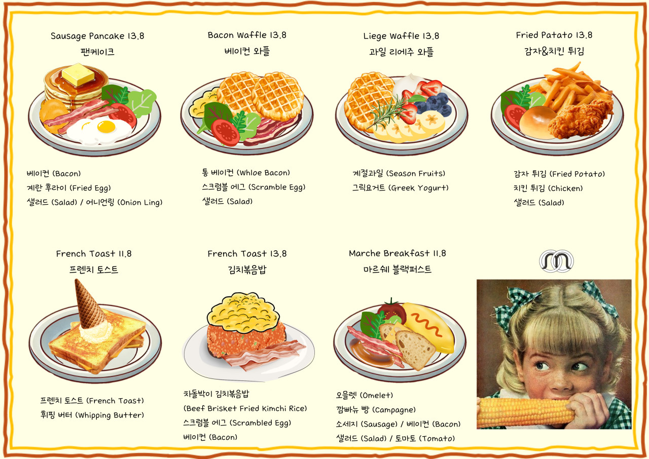 | Sausage Pancake | 13.8 | 팬케이크+베이컨+계란+샐러드+어니언링 |