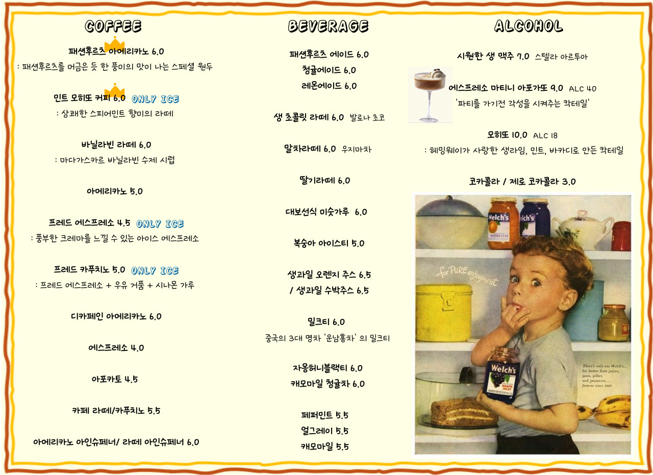 귀여운 일러스트가 그려진 메뉴판,