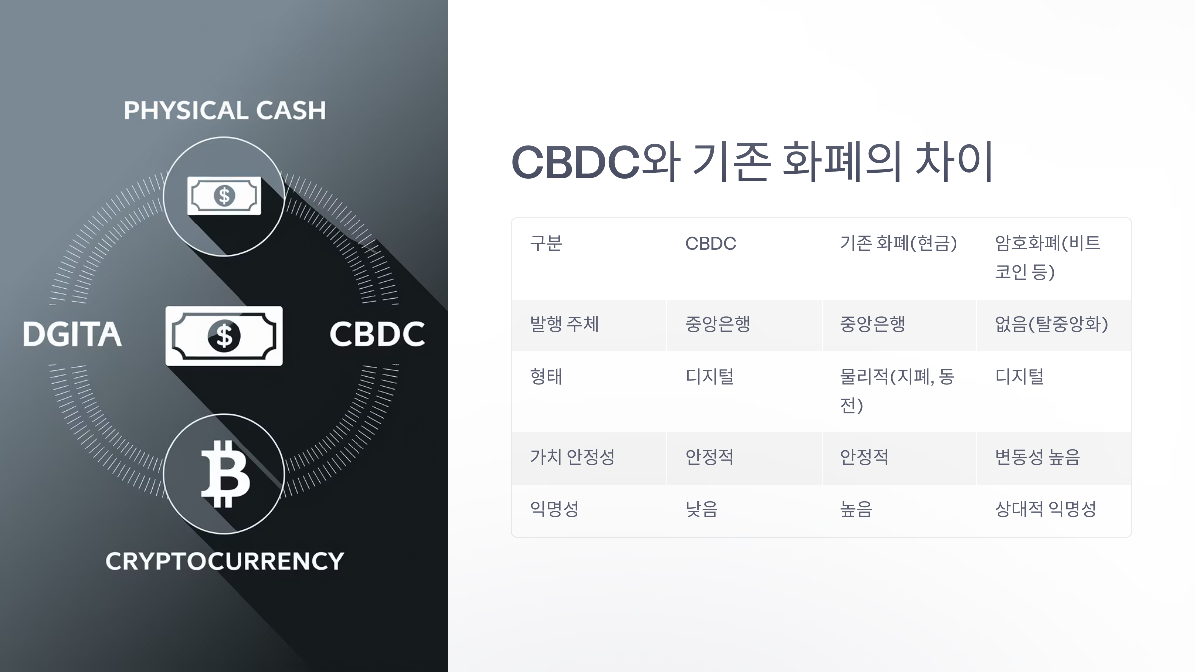 | 가치 안정성 | 고정 (1원 = 1CBDC) | 변동성이 큼 |