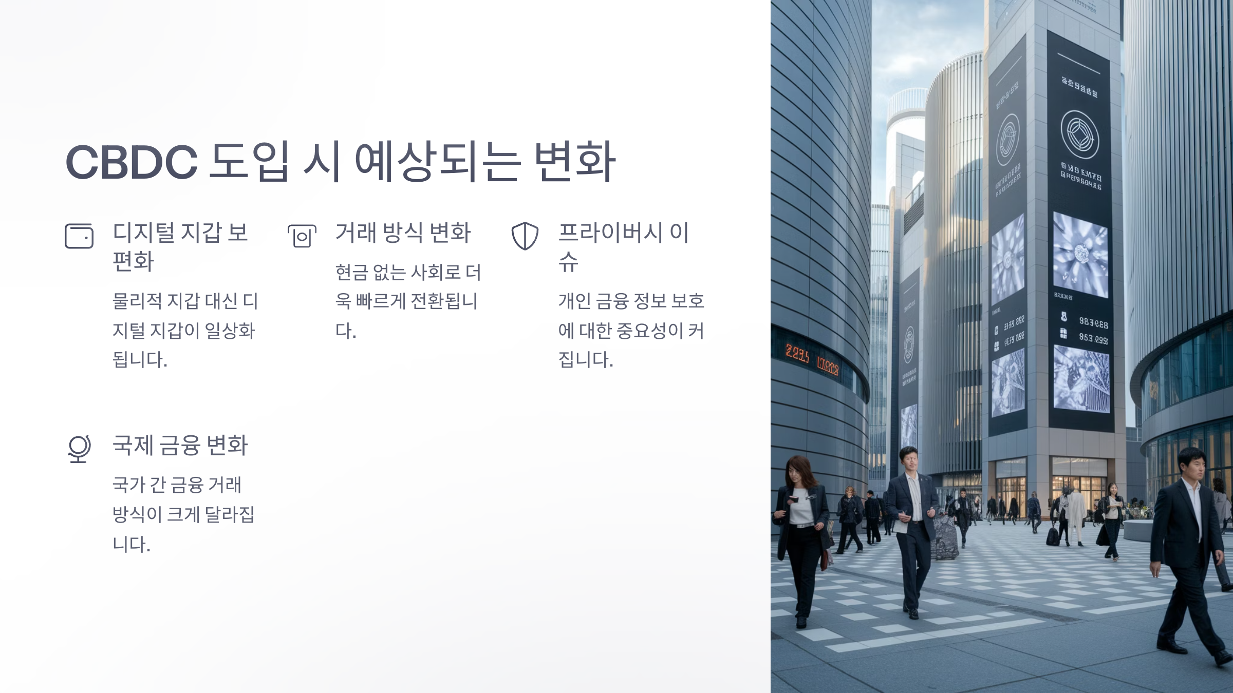 앞으로 CBDC의 상용화가 본격화되면, 우리의 일상과 경제 구조에도 큰 변화가 생길 것입니다.