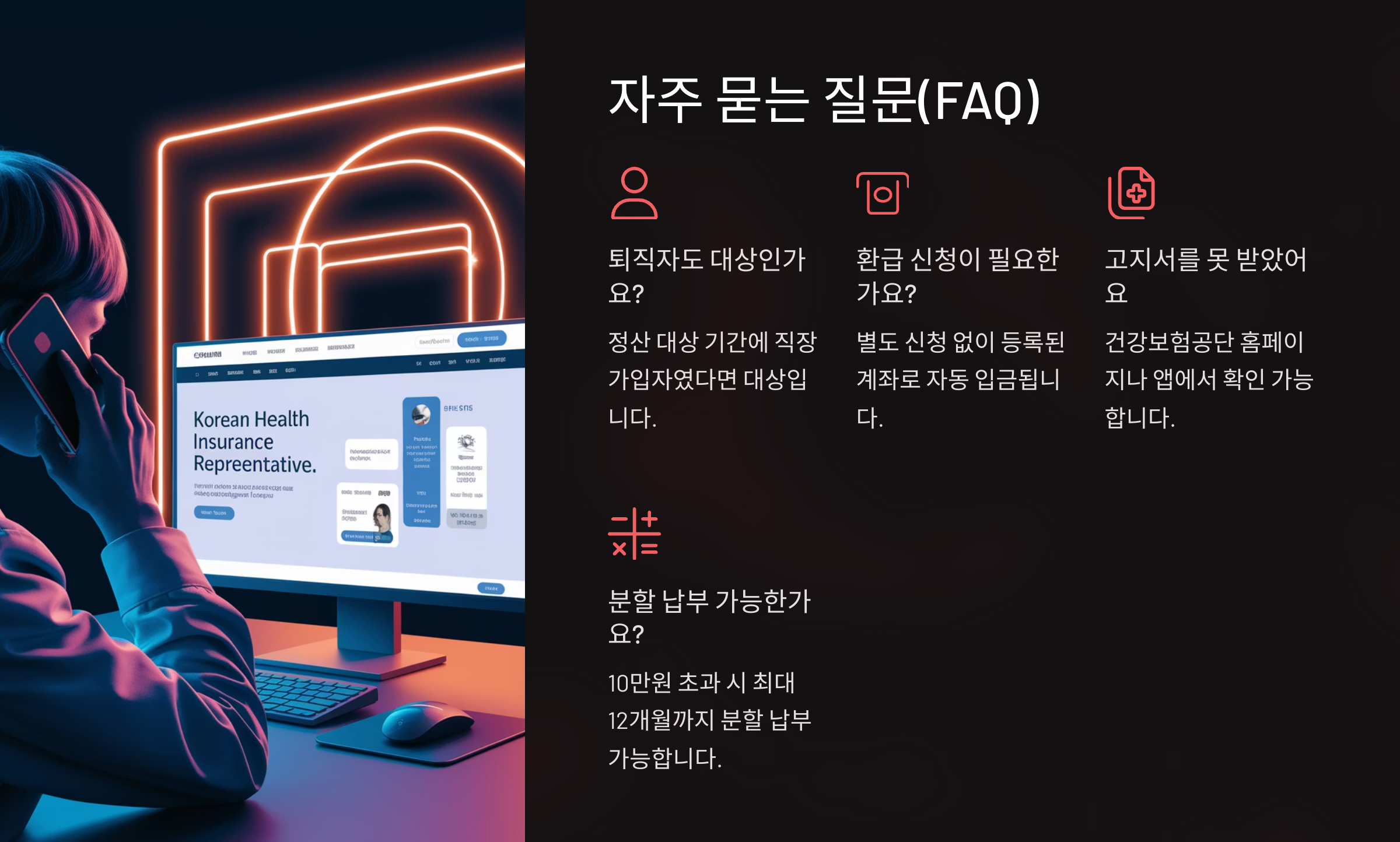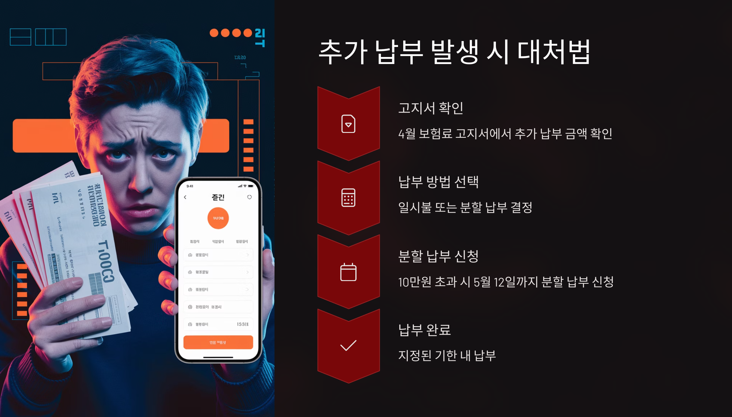 👉 A씨는 4월 고지서에서 추가 납부 금액 확인 후, 건강보험공단 홈페이지에서 12개월 분할 납부 신청을 완료함. 경제적 부담을 줄일 수 있었음.