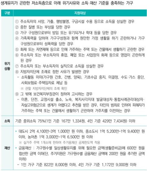 - 위기 상황: 긴급복지 지원제도의 지원 대상은 다음과 같은 위기 상황에 처한 가구입니다.