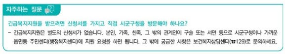 - 전화 문의: 긴급복지지원 콜센터(국번 없이 129)를 통해 문의 가능합니다.