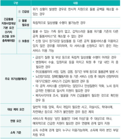 - 노인: 주 돌봄 제공자가 부재하거나 돌봄이 필요한 긴급한 상황에 처한 노인